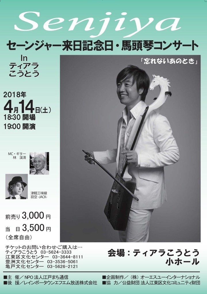 モンゴルの民俗楽器である馬頭琴。その馬頭琴奏者のセーンジャーが、2018年4月14日(土)江東区にあるティアラこうとう・小ホールにてコンサートを開催する。ゲストにはレインボータウンFM 「大江戸ワイド Super Saturday」 でパーソナリティを務める 林渓清氏、そして昨年赤坂でのセーンジャーコンサートにもゲスト出演た津軽三味線奏者の寂空が出演予定。