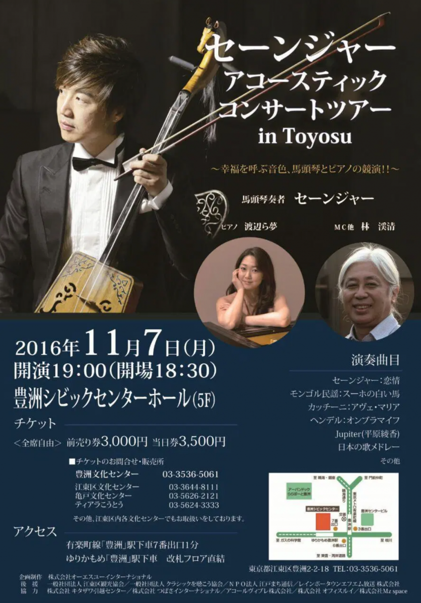 出 演:セーンジャー(賽音吉雅)/馬頭琴、渡辺ら夢/ピアノ、林 渓清/MCおよびトークセッション